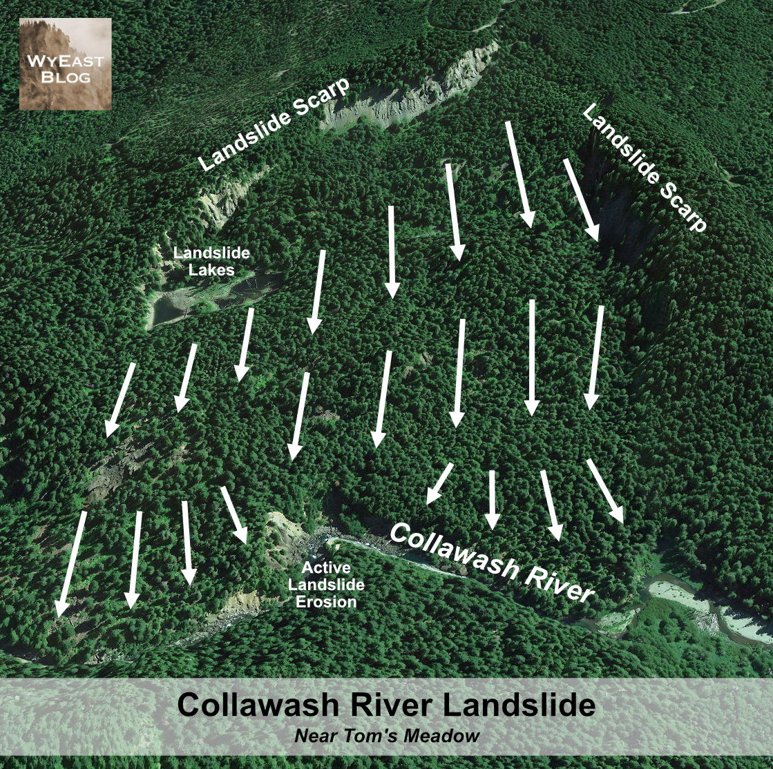Along the way, these landslides also push the Collawash River against solid rock walls along its steep course, allowing the river to gradually cut away at these, as well. Like the erosive process described in this recent article, a solid rock wall that has been persistently undercut by the river eventually collapses, adding still more boulders and loose debris to the river.