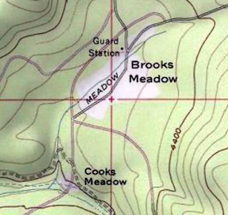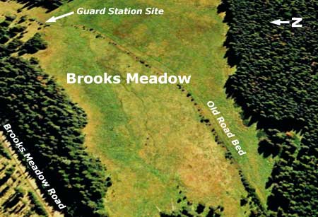 This schematic (below) shows the original trail at the center (now a trench) as a white dashed line and shoulder paths in red dashed lines, where hikers have already destroyed an alarming amount of meadow vegetation.