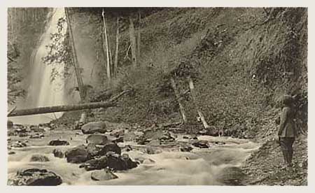 The big boulder and its path of destruction from the opposite side of the Clackamas River