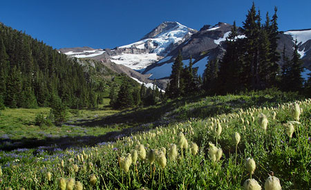 June brings another symbolic favorite, as Elk Cove appeared on the cover of the first calendar, and in several subsequent editions over the years – and almost always from this very spot (below) along the Timberline Trail. As much as the mountain has changed in recent years, this view remains a bit of a constant – always lovely, but especially the Western Pasqueflower are putting on their “Muppets of the Mountains” show.
