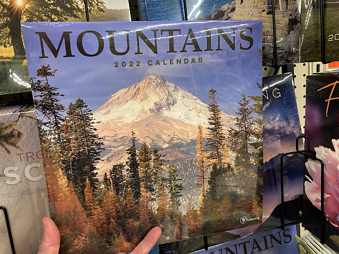 For the January image in the new calendar (below), I selected a view of Mount Hood’s northwest side, with Cathedral Ridge and the Sandy Glacier Headwall covered in an early dusting of autumn snow. On this day last October, the mountain was emerging from the clouds after being socked in most of the day.