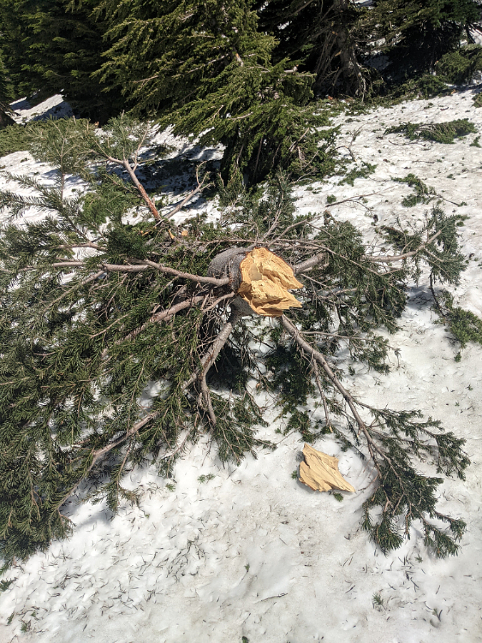 This hiker set their poop bag on a stump, presumably to help remember it on the way out?