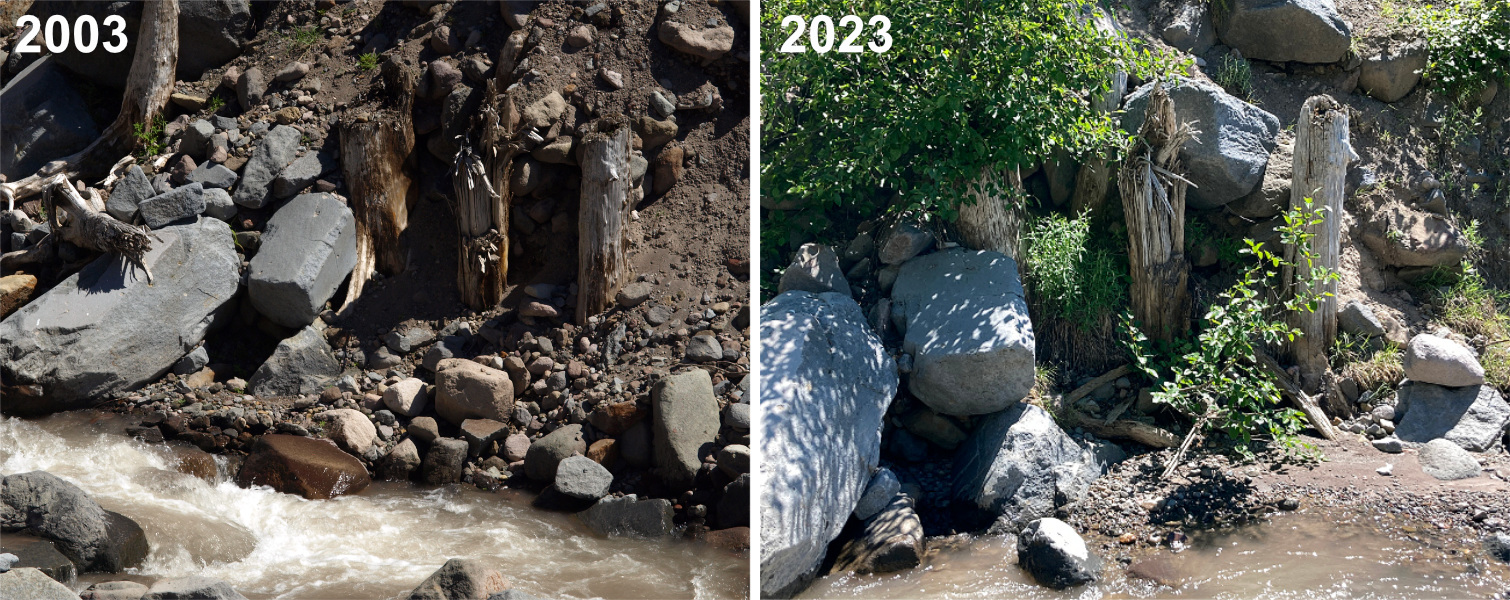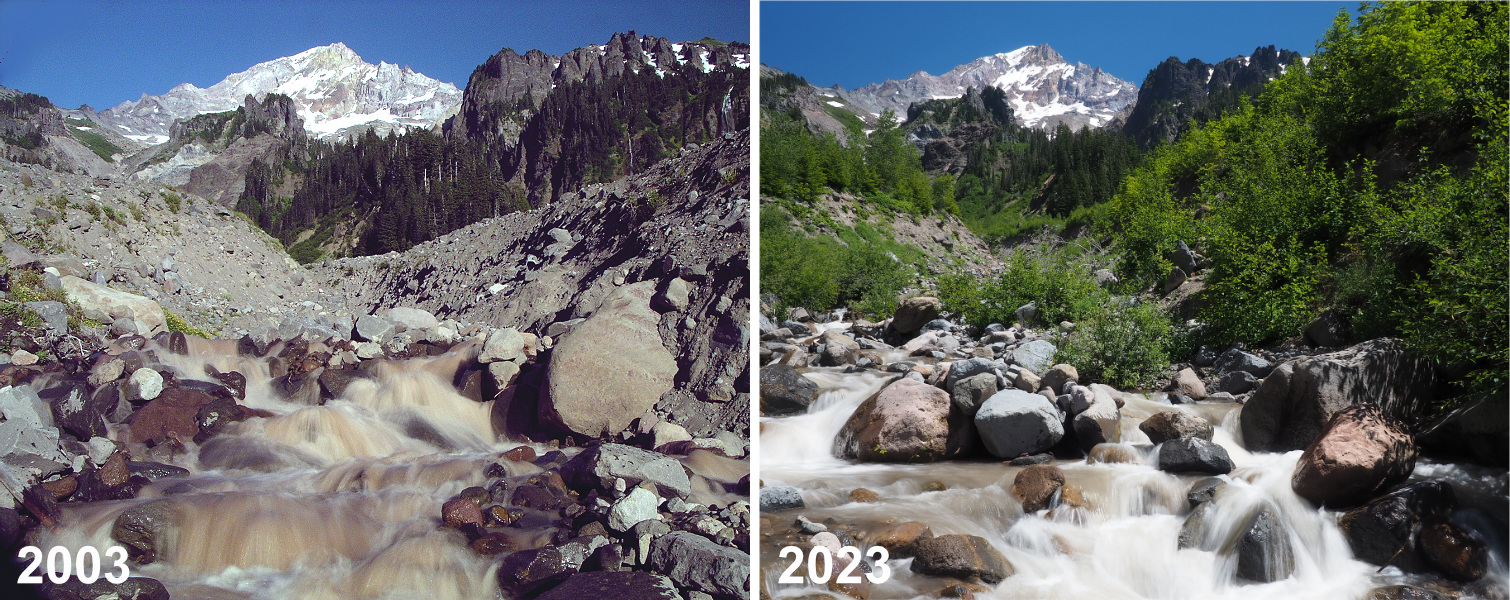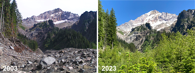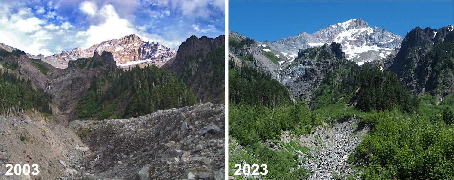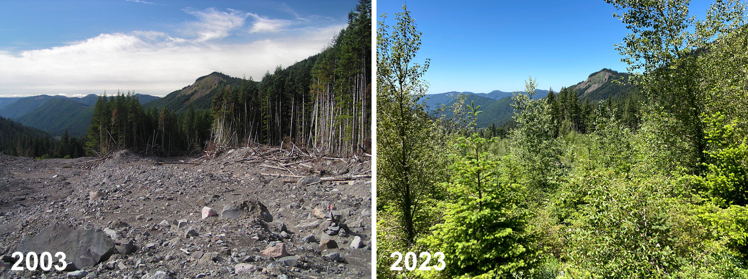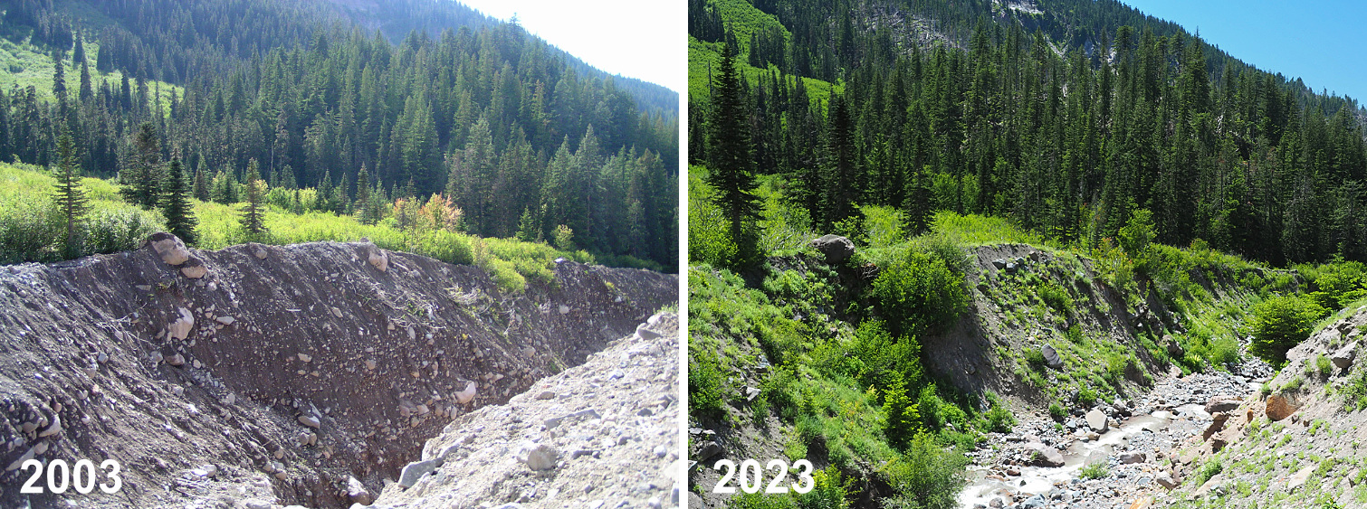 Turning back (east) toward the mountain from roughly the same spot, the view in 2003 (below, left) revealed a new channel through the debris that the Muddy Fork had almost immediately begun excavating. By 2023 (below, right) the channel has been widened over the years, though its depth has since stabilized at the old valley floor level. The second photo also shows the new forest quickly hemming the channel in from both sides.