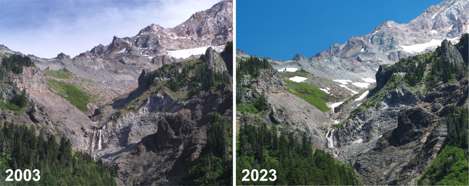 Though it wasn’t apparent to casual visitors from a distance, hikers who knew the mountain immediately spotted the debris flow from the open slopes of Bald Mountain, where the Timberline Trail provides a sweeping view of Mount Hood’s west face. Before the debris flow, the two main branches of the Muddy Fork had similar floodways at the head of the valley, below the Sandy Glacier. As the 2003 image (below, left) shows, the north branch was suddenly much wider. Today, forest recovery has nearly erased signs of the debris field (below, right) from this vantage point.