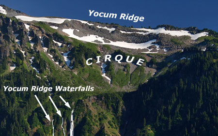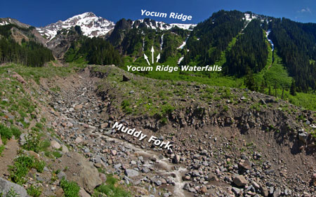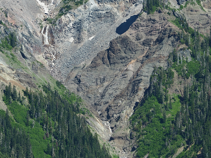 Though the exact origins of the initial landslide remain unknown, the event was probably not triggered by a collapse within the Sandy Glacier that looms above the Muddy Fork, as there were few signs of the debris flow near the glacier, above the section of the upper canyon where the landslide scars were obvious. Instead, the debris flow likely began as a major slope collapse within the steep confines of upper canyon, where the Muddy Fork tumbles between sheer rock cliffs and steep talus slopes.