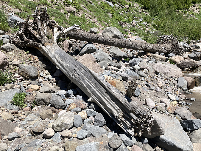 The Muddy Fork quickly excavated a new channel in the debris flow, unearthing trees like these that had been buried on their sides under the debris