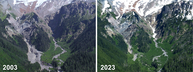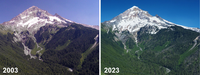 Twenty years later (below, right), most of the forest debris remains, though new logs were added to the jumble in the September 2020 wind event (described in this WyEast Blog article) that swept over Mount Hood. The new, mostly decidious forest rapidly emerging on the debris flow can also be seen in the 2023 image as the bright green band in the mid-background.