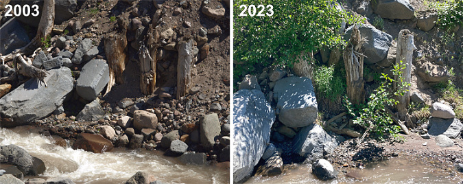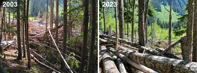 Looking downstream (west) from the center of the debris field in 2003 (below, left) provided a true perspective on the scale of the event, with large debris deposits mounded against heaps of stacked, toppled trees. After 20 years, the recovery (below, right) is rapidly obscuring the view, though Bald Mountain can still be seen over the young tree tops. The tallest of the young trees in the 2023 view are Cottonwood and most of the smaller tree are Red Alder. The conifer in the foreground is a young Douglas Fir – roughly 15 tears old and about eight feet tall.
