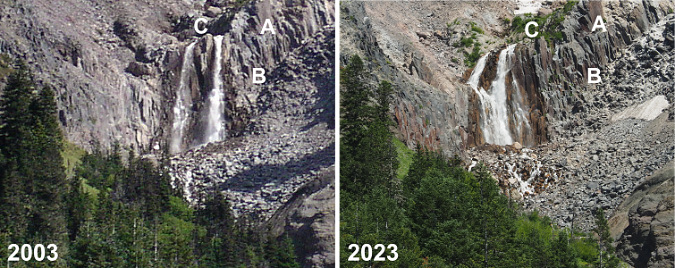 Look closely at the above photo pair and you can also see some very large boulders perched to the left of the falls as they existed in 2003. These have since been eroded away, and contributed to the pile of rock debris that has accumulated at the base of the falls in the 2023 photo –shortening the falls a bit.
