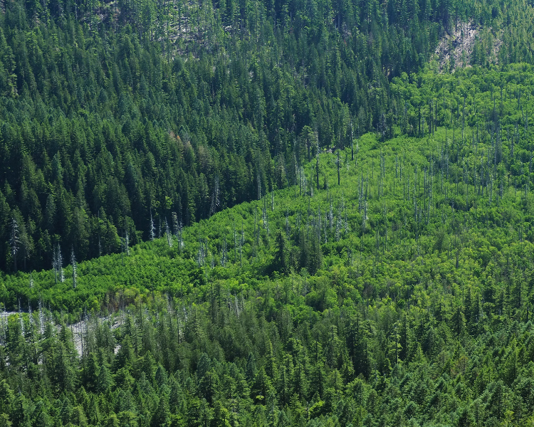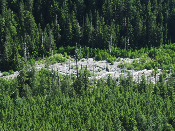Large areas of the debris flow have recovered further downstream from the event, marked by the bright green stands of alder, willow and cottonwood along the Muddy Fork in this view from Bald Mountain
