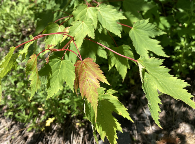 Another surprise in the new forest growing on the debris flow is Douglas maple (above), a close cousin to our Vine maple, and sometimes called Rocky Mountain maple. These attractive trees are sprinkled throughout the young trees returning to the Muddy Fork and they are positioned to become part of the future understory of a mature conifer stand. Where alder and cottonwood are eventually shaded out by taller conifers, Douglas maple are more tolerant of shade, and can coexist with the big trees. They are also more drought-tolerant than their Vine maple cousins, and thus well-suited to the sandy upper layers of the debris flow that can become quite dry during summer droughts.