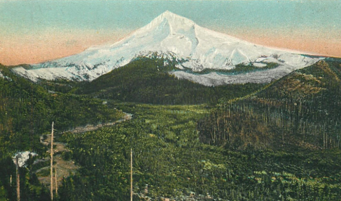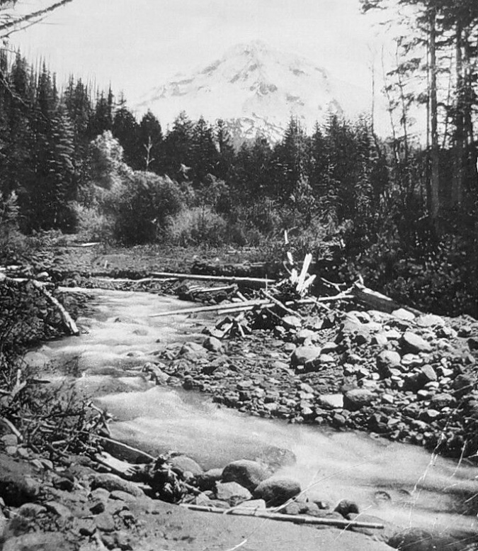 This image (below) is a wider, hand-tinted view from about 1900 that shows the Muddy Fork branch of the Sandy River hugging the left side of the valley, with obvious signs of flooding and debris flows. There’s a story in the young forests covering the balance of the flat Sandy River valley floor, too (known as Old Maid Flat) in this view: at the time the photo was taken, just over a century had elapsed since the Old Maid eruptions on Mount Hood covered this entire valley with a debris flow that extended 50 miles downstream to the Columbia River, creating today’s Sandy River Delta. This very early view also shows burn scars (colorized as white snow) around the western foot of the mountain that have long-since recovered, and are now covered with dense forests of Noble fir.