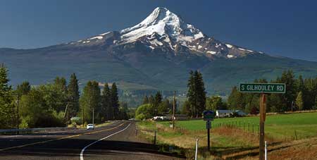 Cracks in the old paving are quickly discovered by moss and grasses. After making a sharp turn in its descent into Tygh Valley, the surviving section of old road points toward Mount Hood for much of its remaining length
