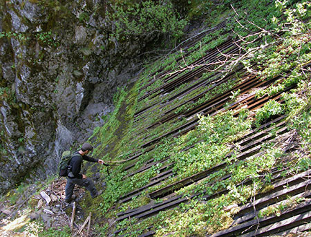 The railroad tie steps were filled with poured concrete pads at some point, making this a very difficult repair job. In the long term, this section of the “official” trail simply needs to be bypassed with a properly graded route and the old goat path turned back to sagebrush