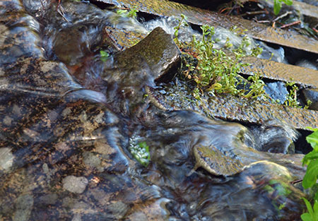 The trail into the canyon as it exists today is deceptive, to say the least. It beings as a wide, paved path that crosses an equally wide plank bridge below the old sediment pond dam. Once across, however, it quickly devolves. Visitors are presented with a couple of reasonable-looking dead-ends that go nowhere (I will revisit one of those stubs in a moment), while a much more perilous option is the “official” trail, plunging down a slippery-in-all-seasons (loose scrabble in summer, mud in winter) goat path. Still, the attraction of the river below — and especially the fascinating powerhouse ruins – beckon, so most soldier on.