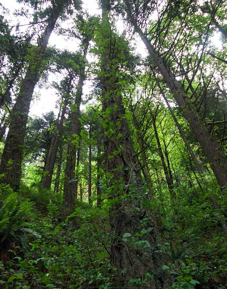 Poison oak is versatile, growing as a ground cover, shrub, or as a towering vine, as in this nightmarish scene along the McCord Creek trail.