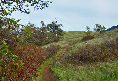 Poison oak growing in shrub form along the Rowena Plateau trail, showing the handsome bronze color of emerging leaves in spring — when the plant is especially toxic.