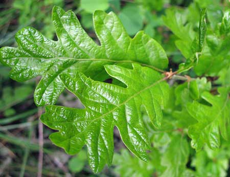One obvious example of a look-alike is the Oregon white oak (below), a classic companion of poison oak, and easily confused where brushy thickets of white oak grow in the eastern Columbia Gorge. Oak leaves are single, however, and usually larger with much deeper lobes than poison oak.