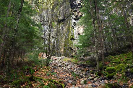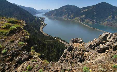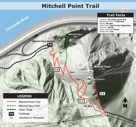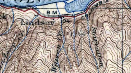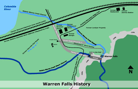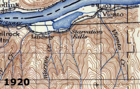 It turns out the original railroad alignment crossed Oneonta Creek on a trestle where the current highway is located today, and was also built snug against the base of Oneonta Bluff. Why was it built this way? Because in the era before Bonneville and Grand Coulee dams were completed in the 1930s (along with the many dams in the Columbia basin that followed), the Columbia River fluctuated wildly during spring runoff. So, the original rail line was built to stand above seasonal flood levels of the time.