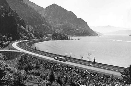 In the 1930 and 1940s, the Oregon Highway Department began a series of projects in the Gorge aimed at “modernizing” the old highway as the dawn of the 1950s freeway-building loomed. A new river-level route was built to bypass the steep climb the original route takes over Crown Point, with the new route following what is today’s I-84 alignment.