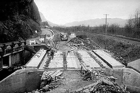 At Tooth Rock (above Bonneville Dam) a new tunnel was blasted through the cliffs to bypass the intricate viaducts built atop the cliffs by Samuel Lancaster. That tunnel still serves eastbound I-84 today, and has become a historic feature in its own right. And at Oneonta Bluff, a new bridge and tunnel bypass (below) took advantage of the relocated railroad, and was completed in 1948.