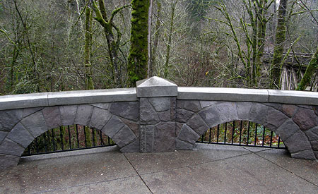 At the west portal to the tunnel (where the original Oneonta Bridge, with its graceful arched railings, still stands), the restoration included a gateway sign, restored, painted guardrails built in the style of the original highway and an interpretive display near the tunnel entrance (below). The design functioned as a wide, paved trail, with the idea that cyclists touring the historic highway would pull off the main road and ride through the short tunnel section on a path closed to cars.