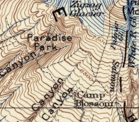 Other hiking routes soon followed on the south side of the mountain, connecting the former Camp Blossom to nearby Paradise Park and the White River canyon. Camp Blossom was built by a “Judge Blossom” in 1888 to cater to tourists. The camp was at the end of a new wagon road from Government Camp, and located near present-day Timberline Lodge. It was eventually replaced by the Timberline Cabin (1916), and later, Timberline Lodge (1938).