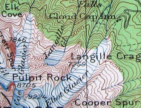 The first recreational trail on Mount Hood followed the South Eliot Moraine from Cloud Cap Inn to Cooper Spur, as shown on this 1911 map.