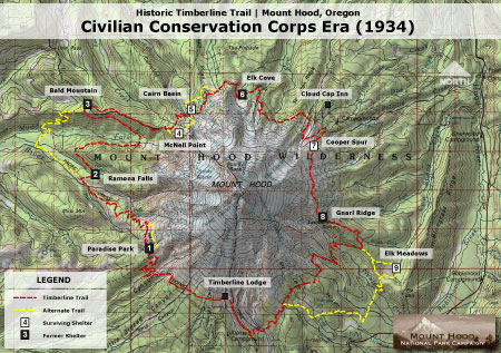 The CCC completed the new 37.6 mile Timberline Trail in 1934, stitching together the existing north side and south side trails, and covering completely new terrain on the remote west and east sides of the mountain.