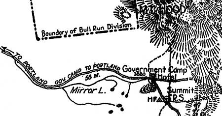 This 1921 map shows the Oregon Skyline Trail terminating at Mount Hood, before construction of the Timberline Trail. Note the early Bull Run Reserve encompassing the entire west side of the mountain.