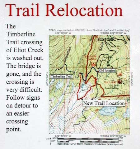 Sign from the first re-route, posted in 2001. Now the trail is completely closed at the Eliot Branch.