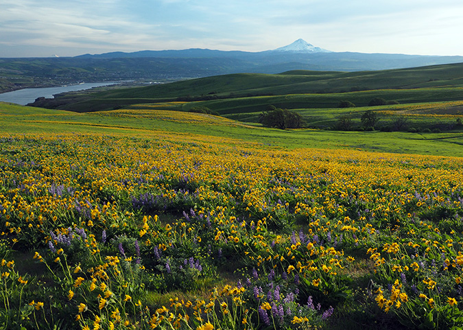 Next, we traced our steps back up the Old Vista Ridge Trail to another viewpoint we had passed along the way, a spot we now know as Alki Point that features a view looking north toward the Columbia River Gorge and the big Washington volcanoes.