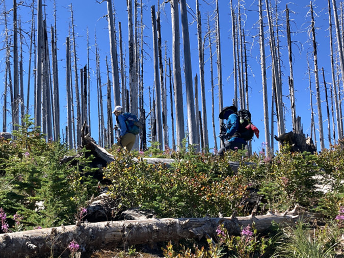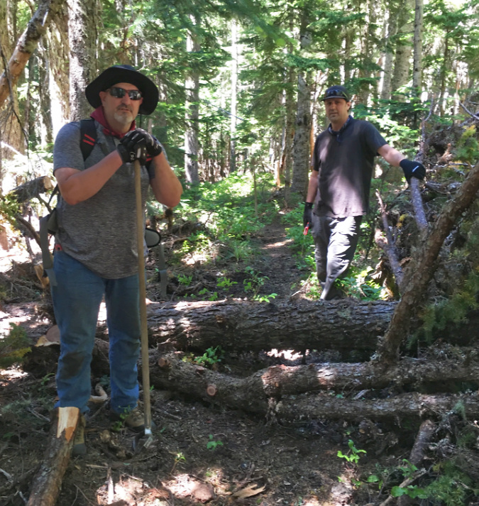 Two weeks after that early July scouting trip in 2017, I was joined by Forest Service (USFS) staff from the Hood River District and Trailkeepers of Oregon (TKO) executive director Steve Kruger for an official walk-through of the trail. The goal was to assess its restored condition and finalize an agreement with the USFS for TKO to adopt and maintain the trail in perpetuity in exchange for it being formally recognized by agency, once again. The USFS team included Claire Fernandez, then the Hood River District recreation manager, and two forest resource specialists, Mike and Ken (below)