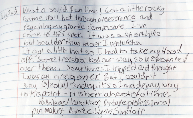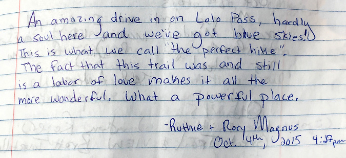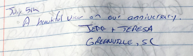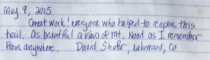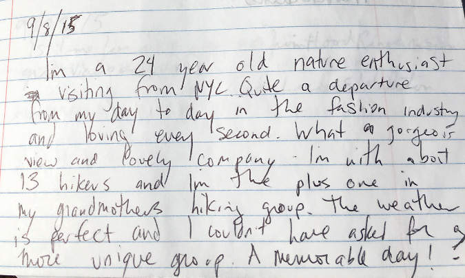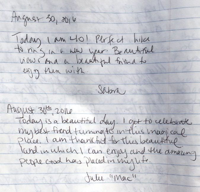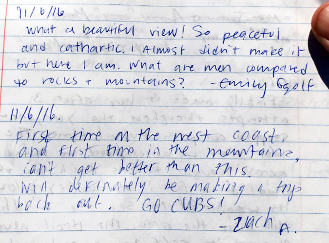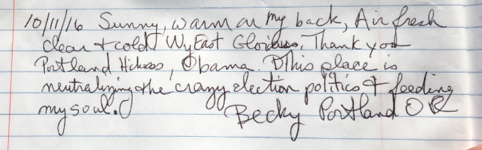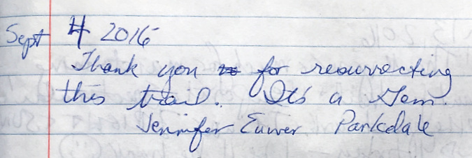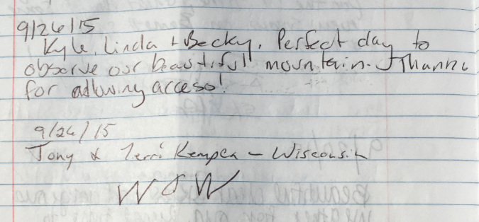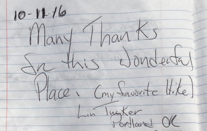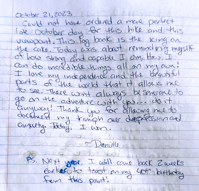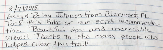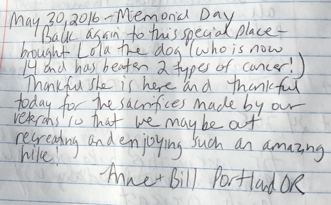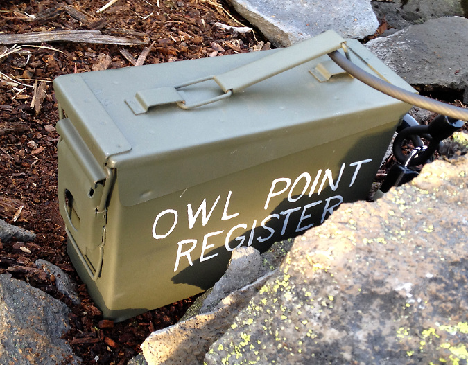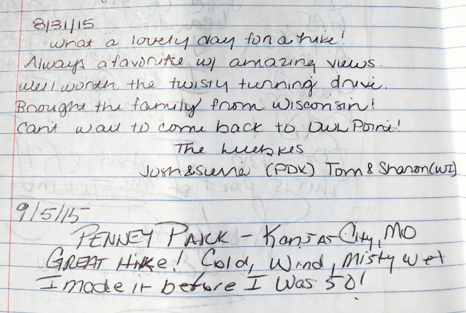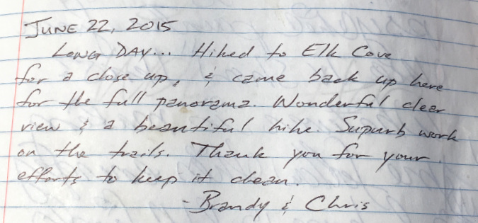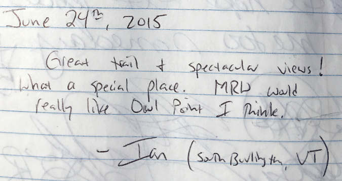 Instead, she carefully packed the log back into the register box after reading entries for a few minutes, then closed the lid and didn’t say a word about it to me. I’ve never asked her, but I suspect as a person who has devoted her professional life to outdoor recreation, she appreciated the dozens of joyful, often quite personal notes that people had been moved to write in the log while at the view from Owl Point.