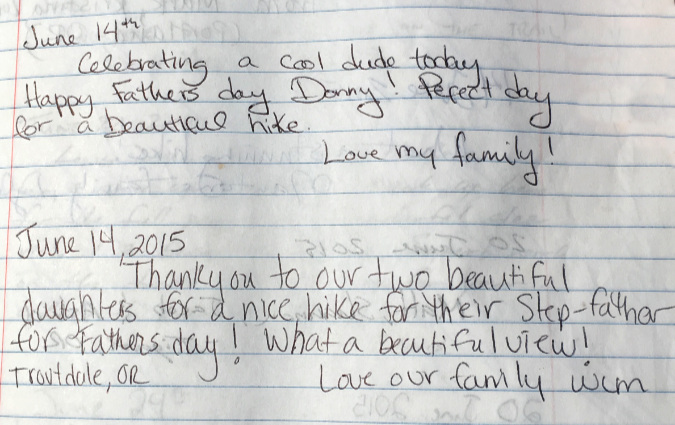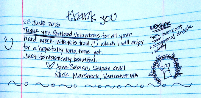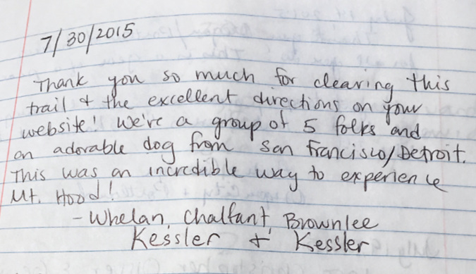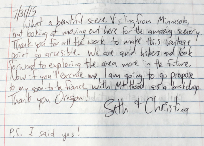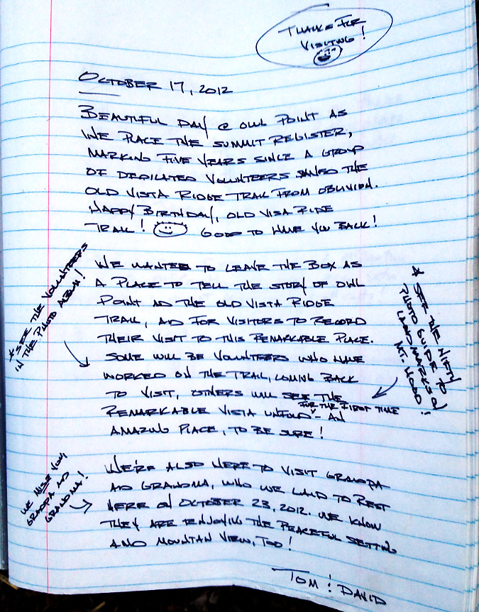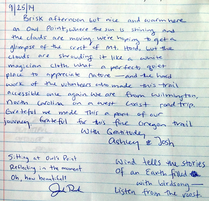 If you haven’t guessed by now, I’ve been involved with TKO and its Oregon Hikers Forum and Field Guide from the beginning, so the grand re-opening of Old Vista Ridge is a pretty big thrill for me. In 2012, we posted a summit log at Owl Point, and there is nothing more rewarding than reading the inspired comments from hikers reconnecting with nature as they take in the view. Here are some samples from the past couple years: