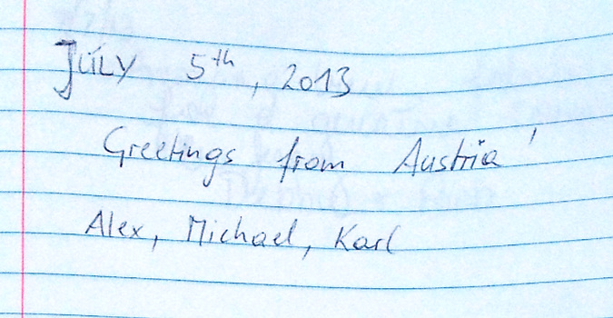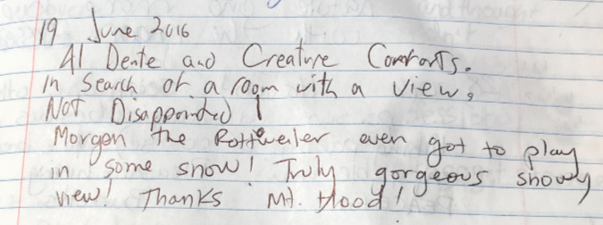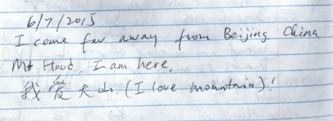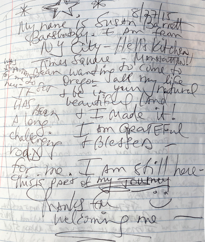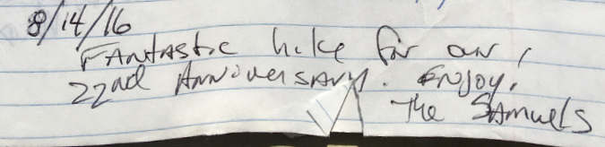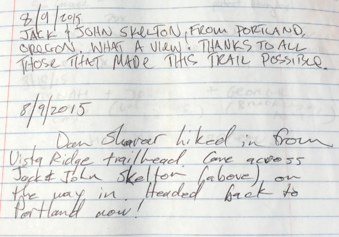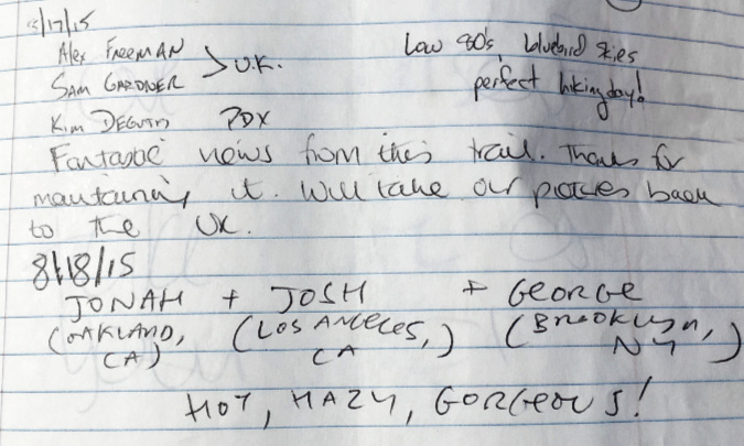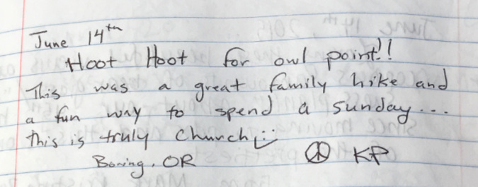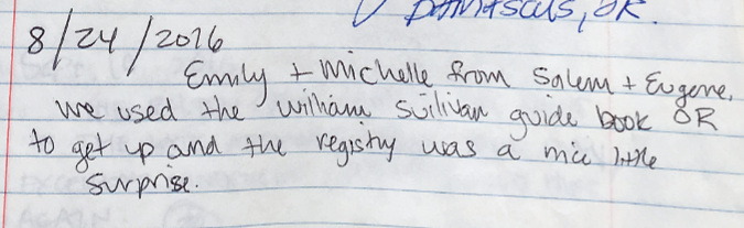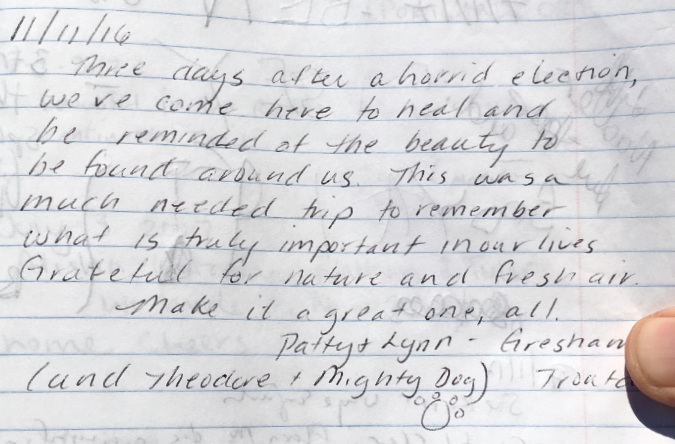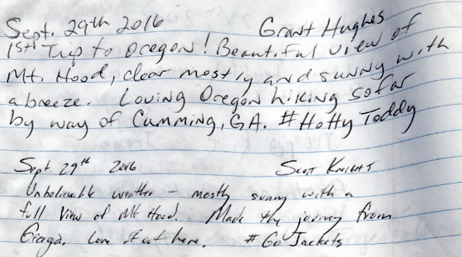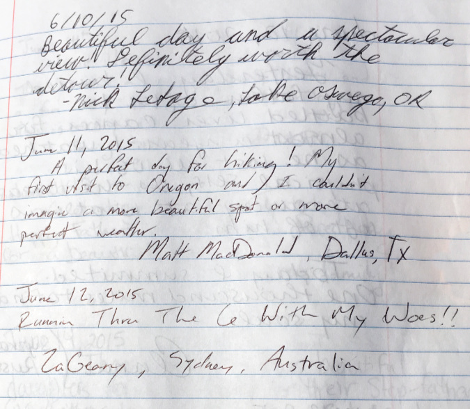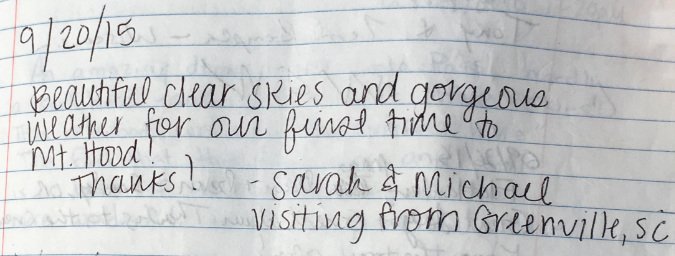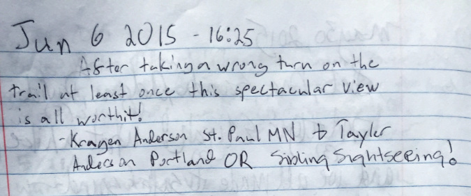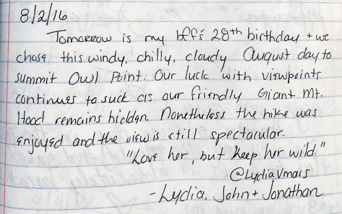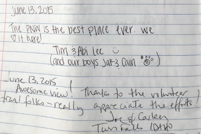 Two groups visiting Owl Point on the same day in late July 2018 shared the sentiment that so many of us can relate to – that we’re so very lucky to live here! My condolences to the folks who made the second entry, too. Vermont is lovely, but not as lovely as the Pacific Northwest (I may have just triggered a few Vermonters):