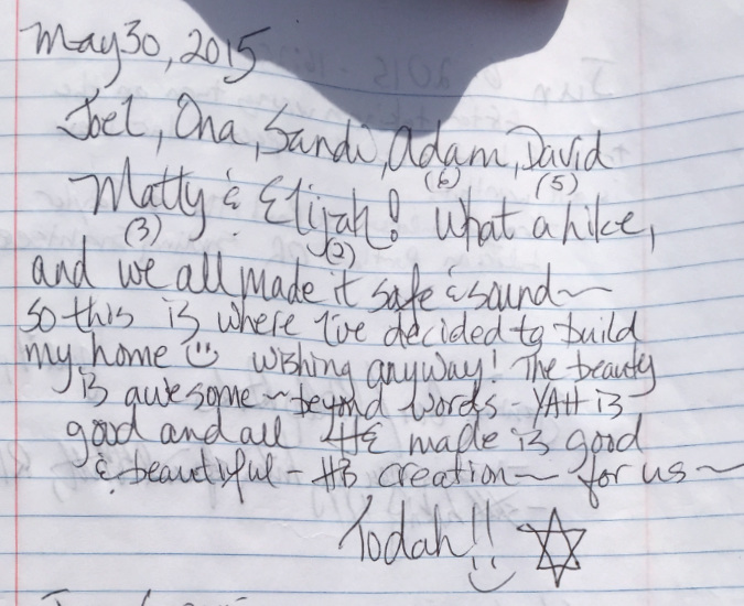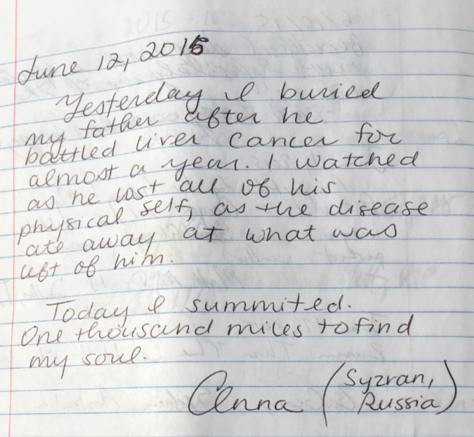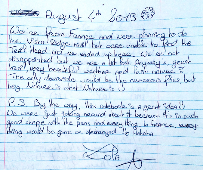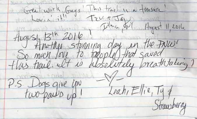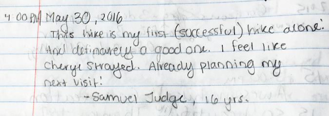 I love the following message from a first-time solo hiker. Noting the date, it is surely must have been one that Claire read when she opened the log four days later? Perhaps it was this wonderful, heartfelt entry that saved the Owl Point Register?