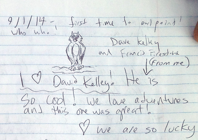 While there are a few posts in the Owl Point Log that mention overnight stays, they’re not common. I suspect that’s mainly because there’s no water source up there, and thus the group above would have had to carry water in (including for Cedar) to augment the wine and beer!