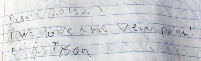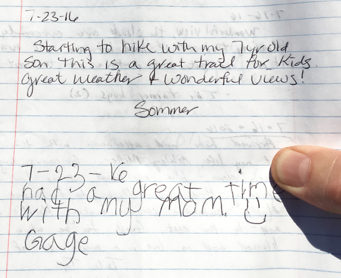 When we reached Owl Point, I held my breath as Claire immediately spotted the register box, then opened it and began reading through some of the messages in the log. I watched out of the corner of my eye from fifteen feet away, pretending to take photos. I was certain we would be asked to remove it, along with the hand-made trail signage. In just five years, the box had become an important part of what made Owl Point such a fun hike, and I was dreading a request to remove it.