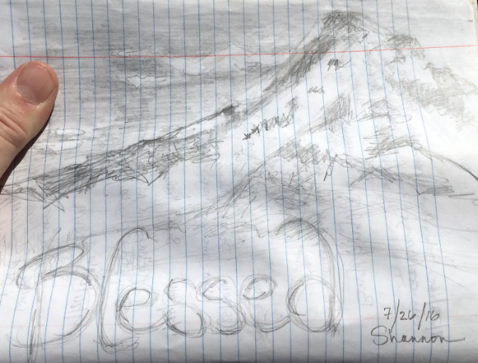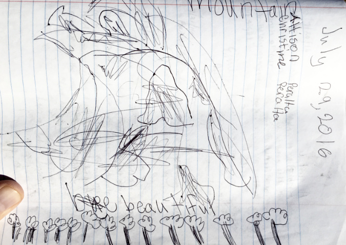 Hiker Jim (below) was apparently so elated with the view from Owl Point in September 2018 that he was suspended in mid-air above the rocks (or so I interpret his sketch):