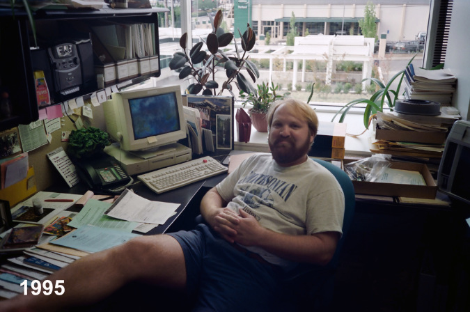Young punk in the 90s in luxury window cube…. This was weekend attire, by the way. The internet hadn’t been invented just yet, so working overtime mean a trip into the office, typically on Saturday mornings. Lots of museum pieces on my desk – notably, Kodak slide trays and a preview carrousel projector on the far right that we called R2D2. Fancy cassette/CD boombox on the shelf (probably playing Everclear or Green Day… it was the 90!) and a Macintosh Centris computer on the desk.