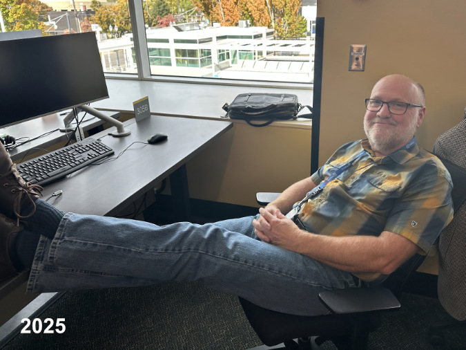 Old fart reprising the previous 90s pose in my old cube for a photo-op a few weeks ago. CRT monitors have long since given way to flat screens and I don’t think the younger workers could identify a slide tray if I were to put one in their hands. The building was completely remodeled after COVID to a “hoteling” format with no formal offices. Today, most workers (myself included) working a hybrid schedule of telework/in-person days. It’s a brave new work office world!