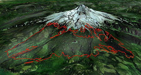 TKO’s vision is to construct a roughly one-mile connector from Perry Lake to the upper trailhead of the Laurance Lake trail. This schematic shows the proposed connector, as viewed from high on Mount Hood, looking north: