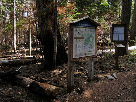 The Laurance Lake Trail was built sometime in the early 1990s and originally envisioned as a mountain bike loop. However, a landslide destroyed the old logging spur that was intended to complete the loop. Later, that part of the planned route was incorporated into the Mount Hood Wilderness, and bicycle travel is now prohibited there.