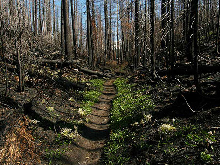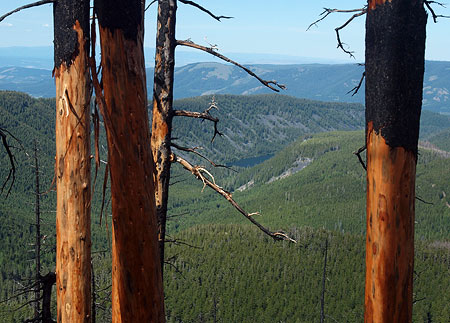 The orphaned stub of the Laurance Lake Trail remains popular for the views of the lake (below) from the open talus slope the trail traverses and the easy uphill grade that was originally built for bikes.